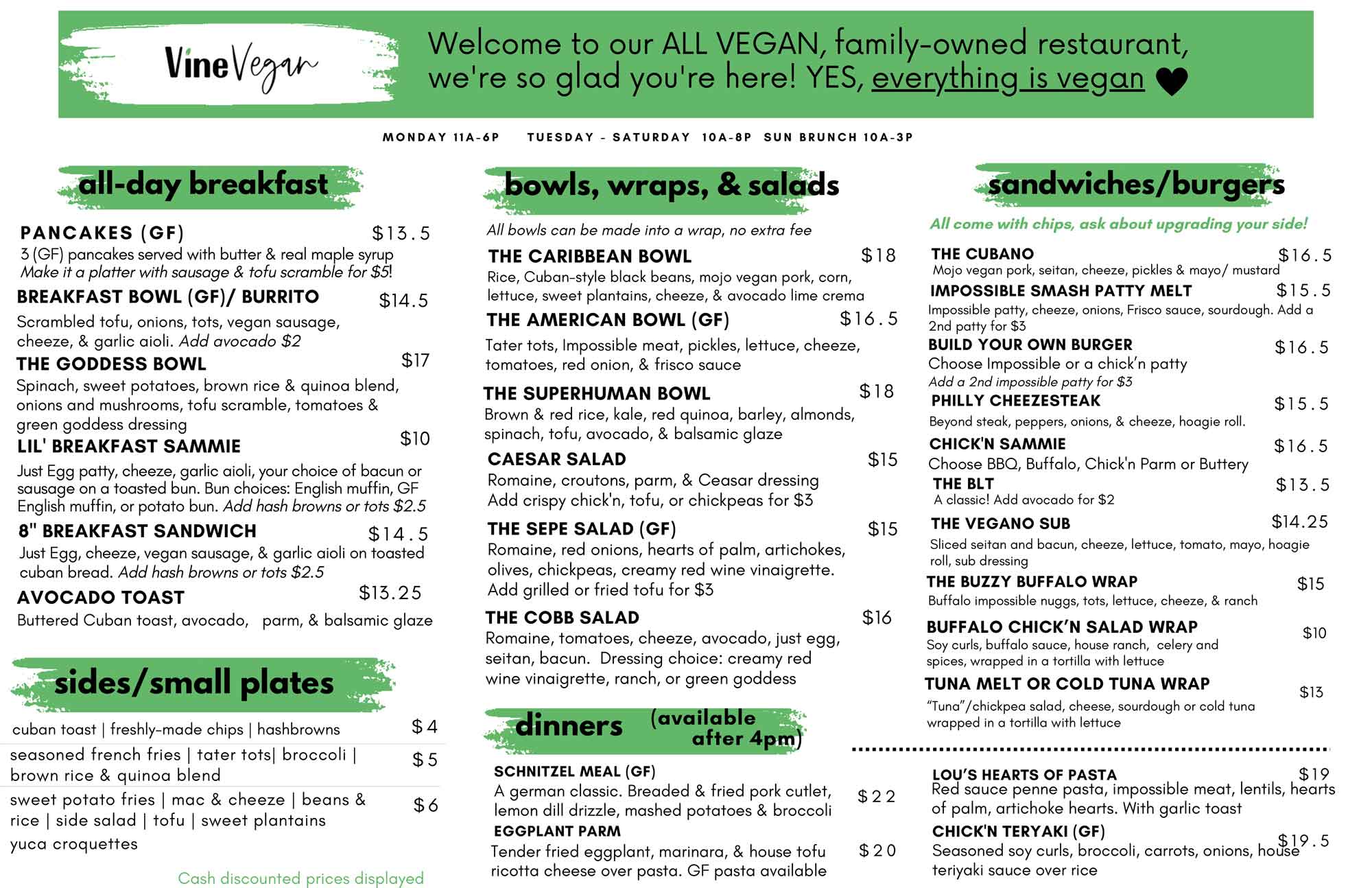 Vine Vegan offers delicious and traditional meals, along with a scrumptious variety of healthy meals and vegan comfort food alike. We welcome the food adventurous and plan to make this a place where everyone can grab a bite to eat.